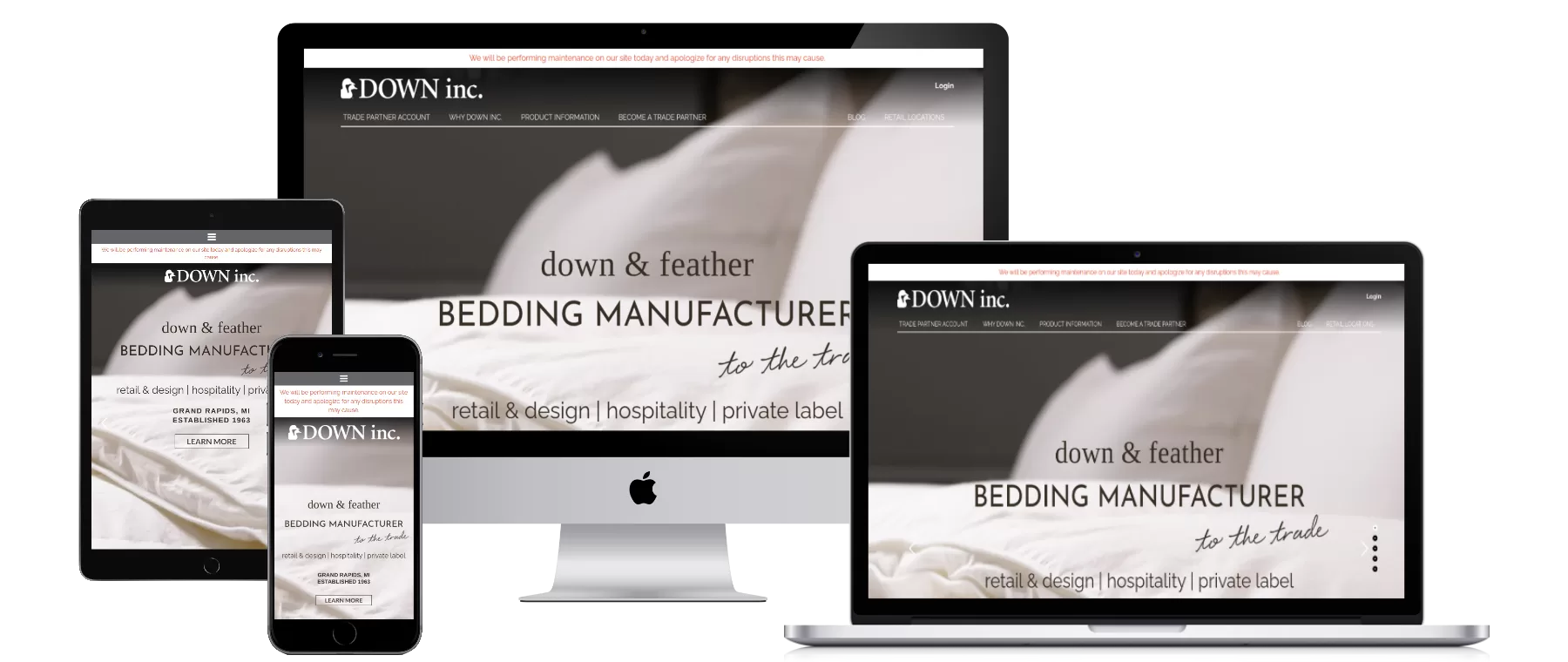With over 50 years of history, DOWN inc. specializes in high quality down and feather bedding products for the residential, design and hospitality trades. The DOWN inc. team partnered with the Pixelvine crew to work closely together on a highly customized eCommerce website that would serve as the hub for their new digital marketing strategy. Rich photography, engaging content and efficient online ordering system all make for a beautiful website experience for the visitors of downinc.com.